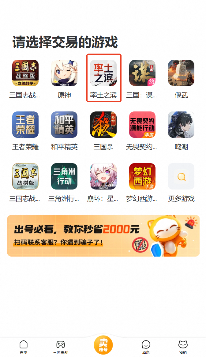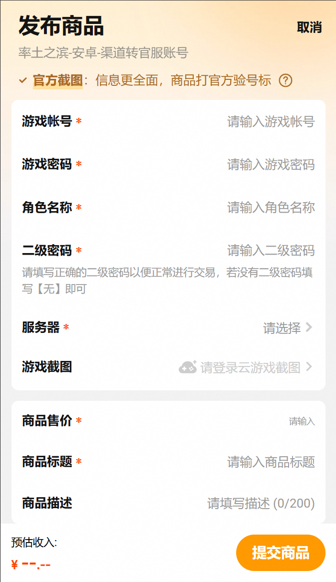 售卖《率土之滨》账号→商品类型选择渠道转官服账号→填写信息提交商品。
