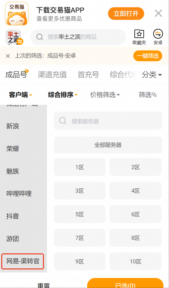 4. 如用户需要筛选已经通过OPPO端转移至网易官方的账号,可在《率土之滨》商品页筛选网易-渠转官处查看。